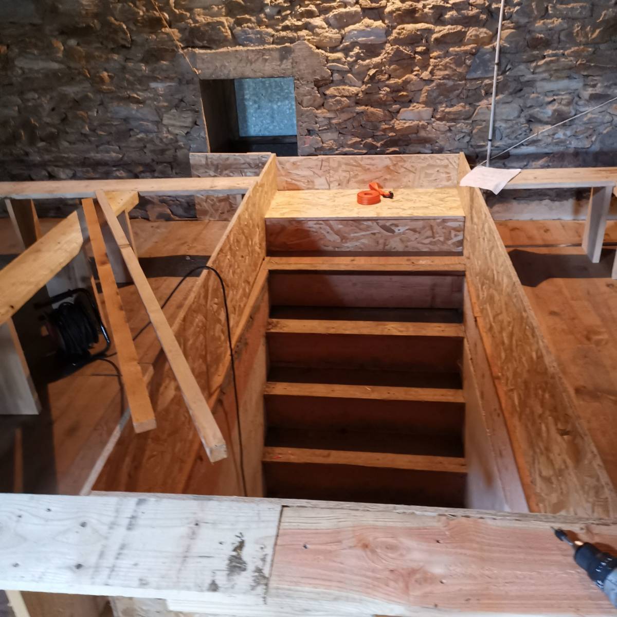 Chantier d’isolation de combles perdus : Réhausse de trappe, création d’un chemin d’accès (platelage) puis soufflage de ouate de cellulose sur 35cm.