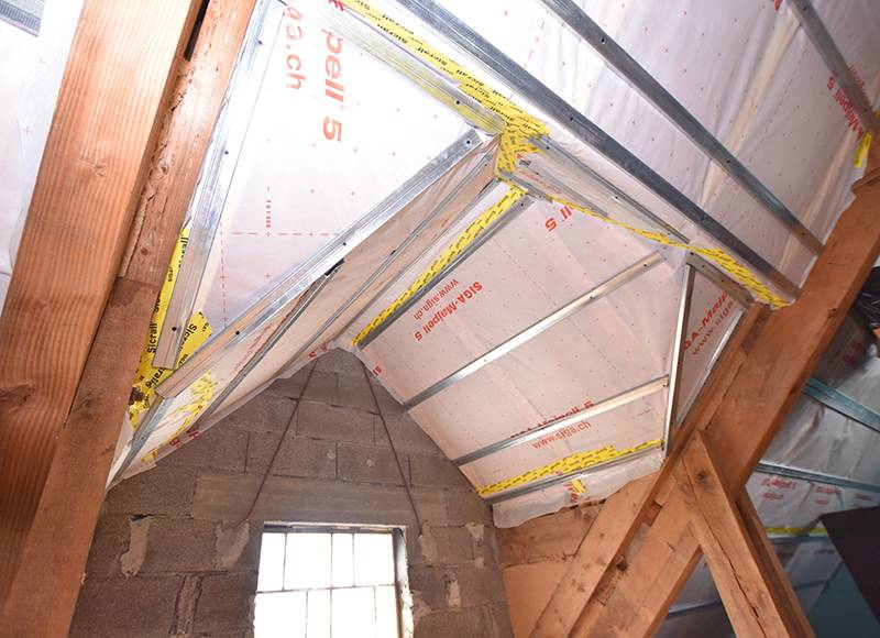 Isolation des pignons et fond de rampants en Placo 13+120. Les avantages de la pose de l'isolation de pignons est sa facilité de pose.