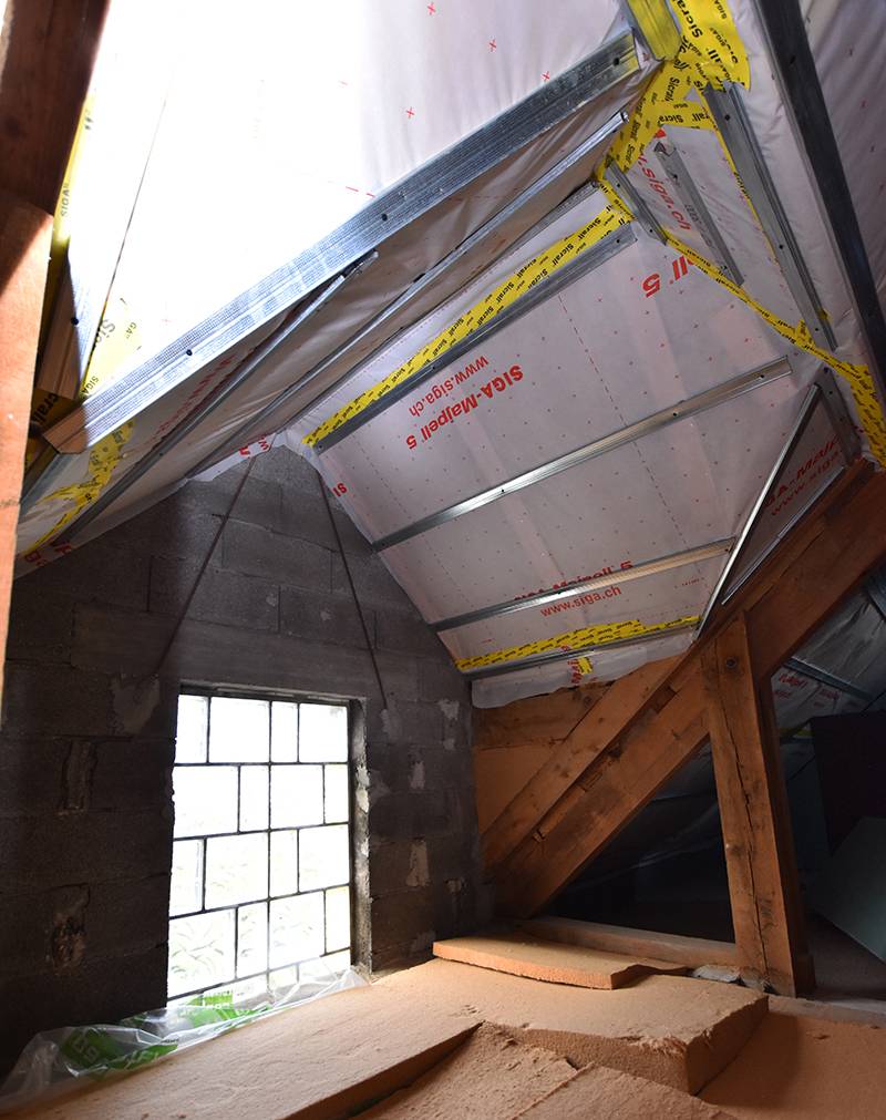 Chantier d’aménagement de combles : création d’une ossature bois, contre littelage + frein vapeur et adhésif, isolation en panneaux de fibre de bois semi-rigides. Dans l’attente d’une finition placo.
