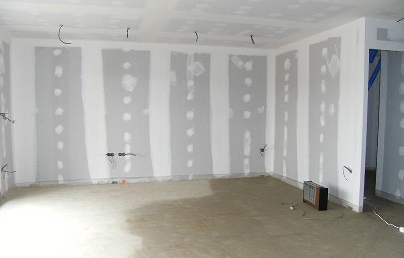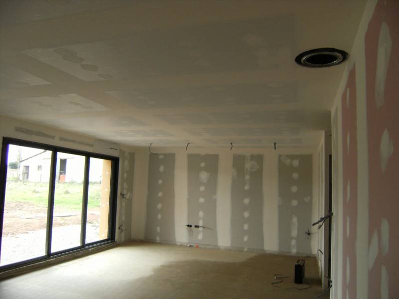 Finition des murs intérieurs d’une maison neuve isolée par l’extérieur et création de cloisons et faux plafonds en BA13 (livraison joints 3 couches non poncés).