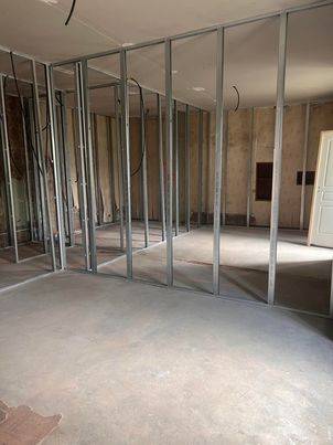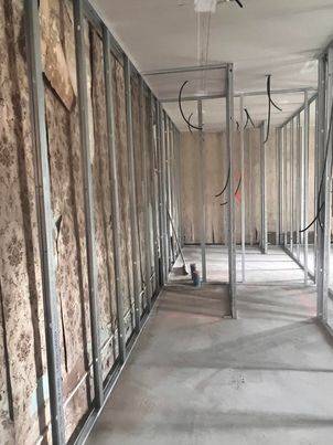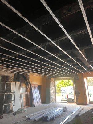 Pose d'ossature métallique sur tous les murs périphériques, création des cloisons, et sur les plafonds pour, en suivant :